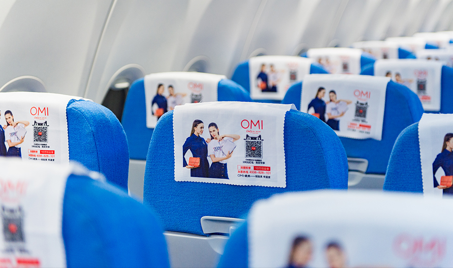 一進(jìn)入機(jī)艙,每個(gè)座椅上醒目統(tǒng)一的頭片廣告,全艙集中呈現(xiàn),營造出一種沖擊力極強(qiáng)的視覺